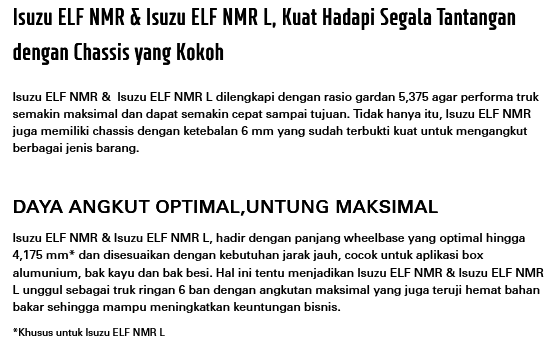 Isuzu ELF 6 Ban memiliki daya angkut maksimal hingga 8,25 ton, cocok untuk mengangkut barang dalam jumlah besar. Varian seperti NMR Short dan NMR Long menyediakan fleksibilitas sesuai kebutuhan bisnis Anda, dengan dimensi yang memungkinkan pengangkutan barang lebih efisien.